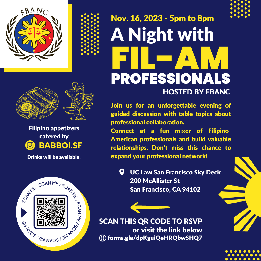 Save the date! Come join us on November 16 at the UC Law San Francisco Sky Deck for a discussion on professional collaboration with our Fil-Am professionals! This is an excellent chance to expand your professional network and to build valuable relationships in the FBANC community and beyond. To RSVP, visit: forms.gle/dpKguiQeHRQbwSHQ7